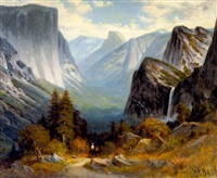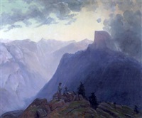 Two figures on the rim of Yosemite Valley with Half Dome in the distance